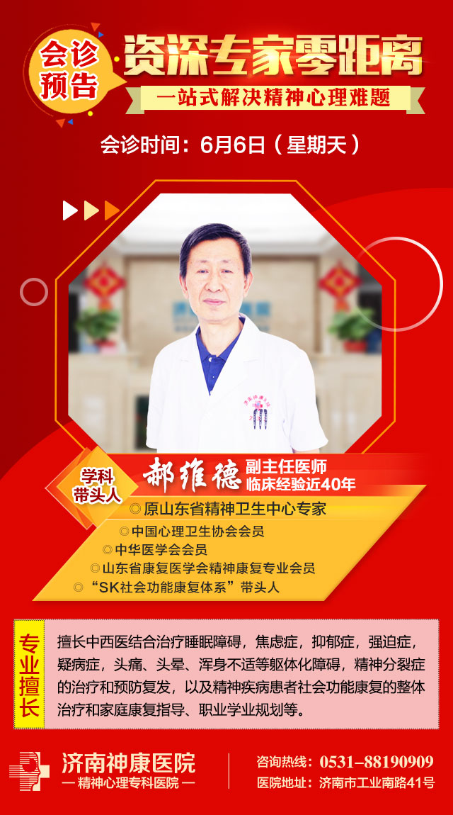 6月6日(本周日),我省知名精神心理专家、原山东省精神卫生中心精神科副主任医师郝维德主任开展零距离会诊活动。届时郝主任将会对久治不愈的失眠,抑郁,焦虑,精神分裂,酒精依赖症、神经衰弱、强迫症、躁狂症、双向情感障碍等患者,进行零距离详细问诊,解答患者疑虑,提供个人专属诊疗方案,一站式解决精神心理疑难疾病困扰。为保障会诊质量,每日限20人,抢约热线:0531-88190909